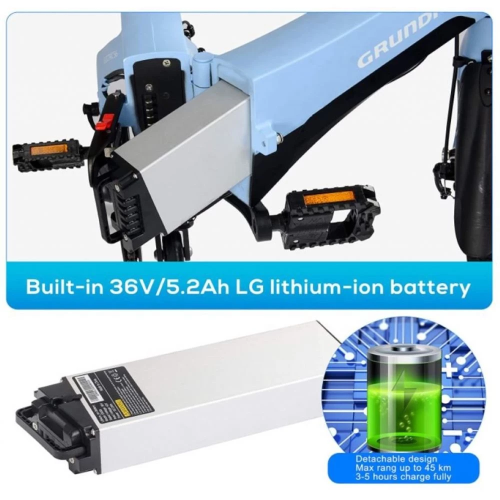 Grundig S6 leveres med en kraftig 250W motor og et kraftigt batteri på 36V/5.2 Ah der giver op til hele 50 km`s kørsel på en opladning.
