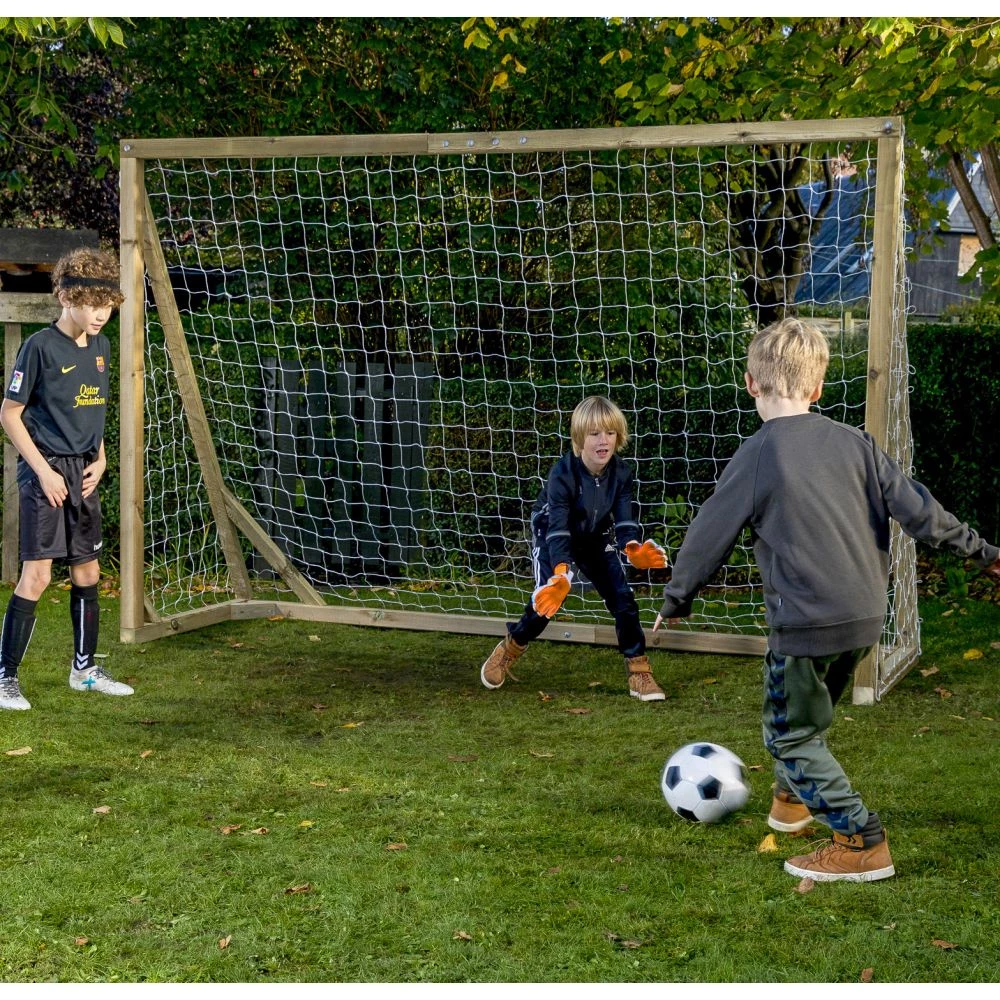 Fodboldmålet er i massivt 70×70 mm fyrretræ som er særdeles modstandsdygtigt overfor vind og vejr, og nettet er med en trådtykkelse på 3 mm blandt markedets kraftigste. Målet er imprægneret, og holder naturligvis til at stå ude hele året rundt.