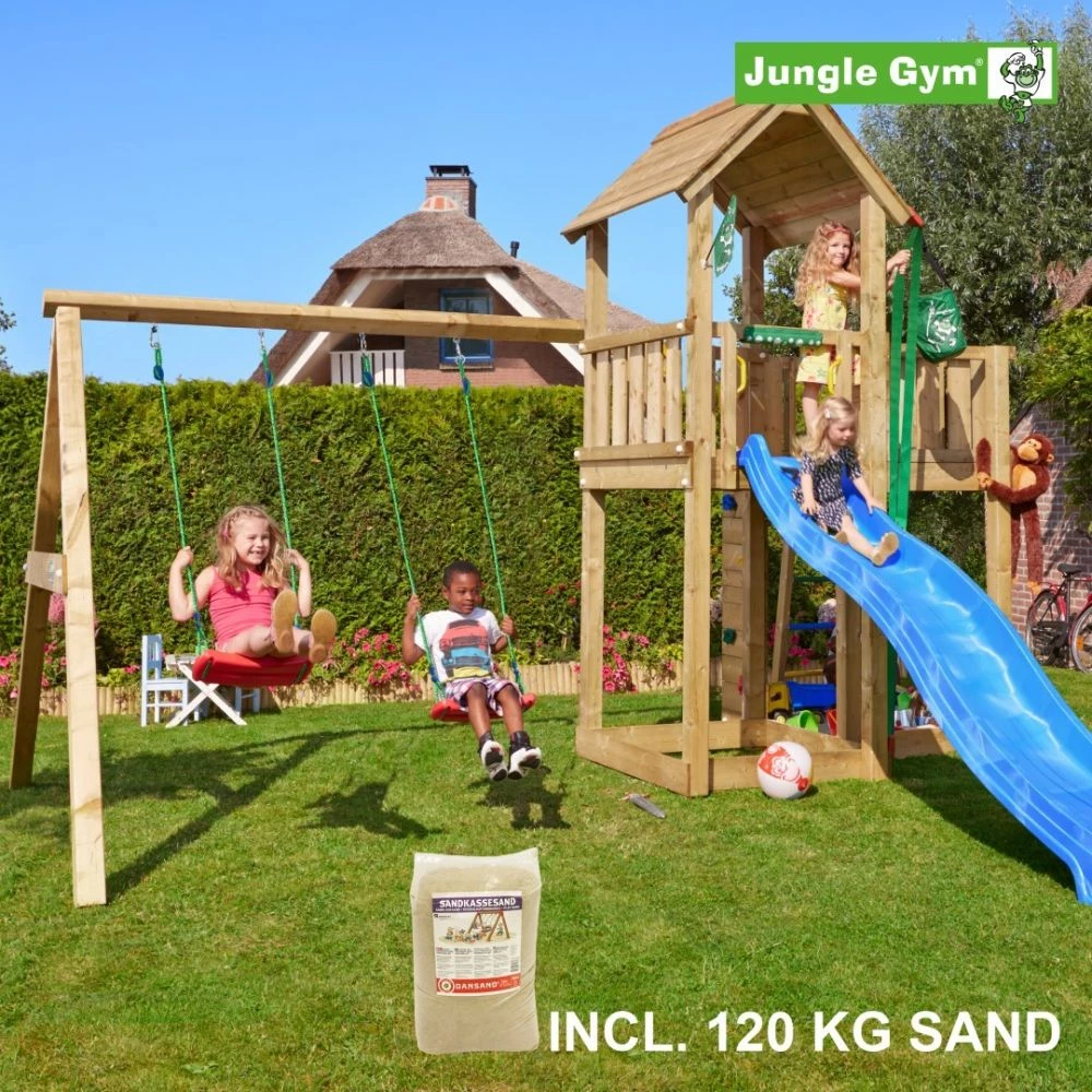 Jungle Gym Mansion legetårn komplet inkl. swing module xtra, 120 kg sand og blå rutschebane – 804-267SXSB