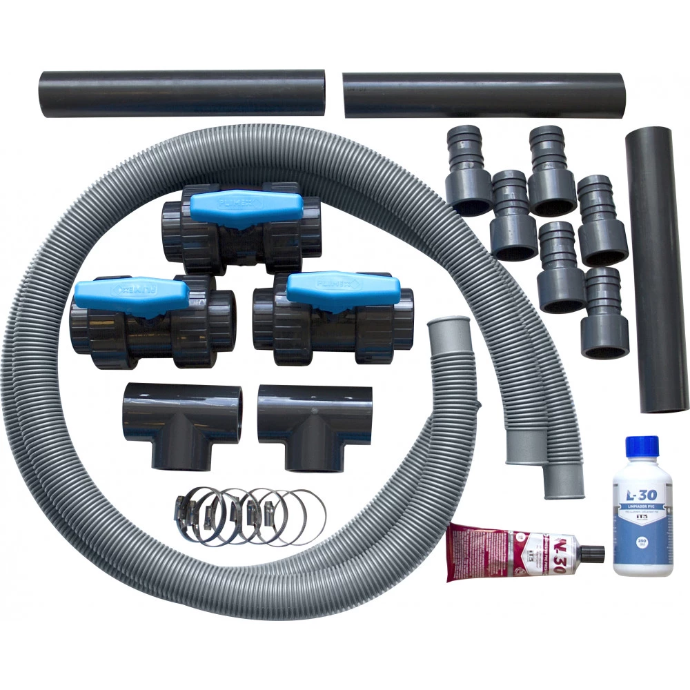 Indeholder 3 lukkeventiler Ø 50 mm, 2 T-stykker Ø 50 mm. 3 rør 30 cm Ø 50 mm. 6 slangeadaptere Ø 50 to Ø 38 mm. 2 Poolslanger 1.5 m Ø 38 mm. 6 spændebånd, Primer and lim.