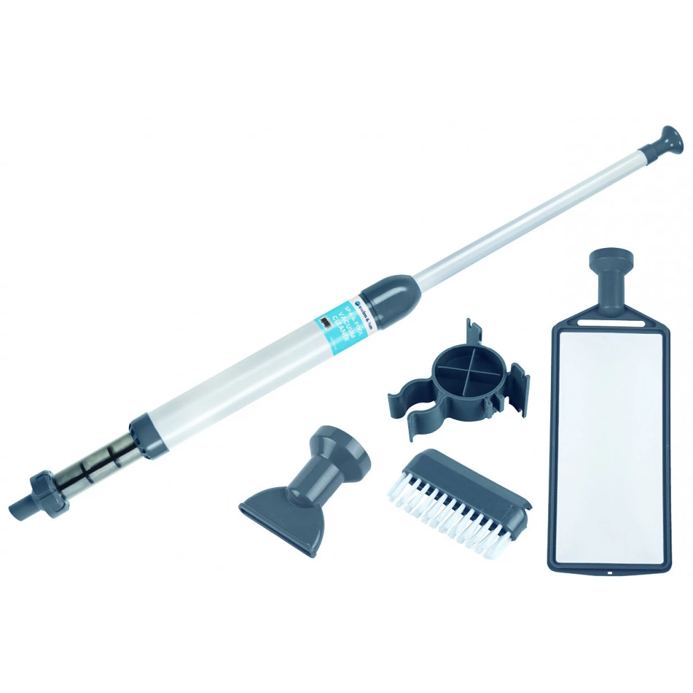 Sættet inkluderer børste, overfladeskimmer, en bred og en smal sugedyse samt praktisk vægophæng.